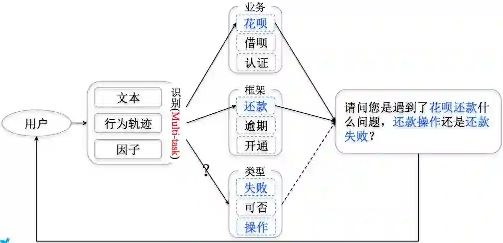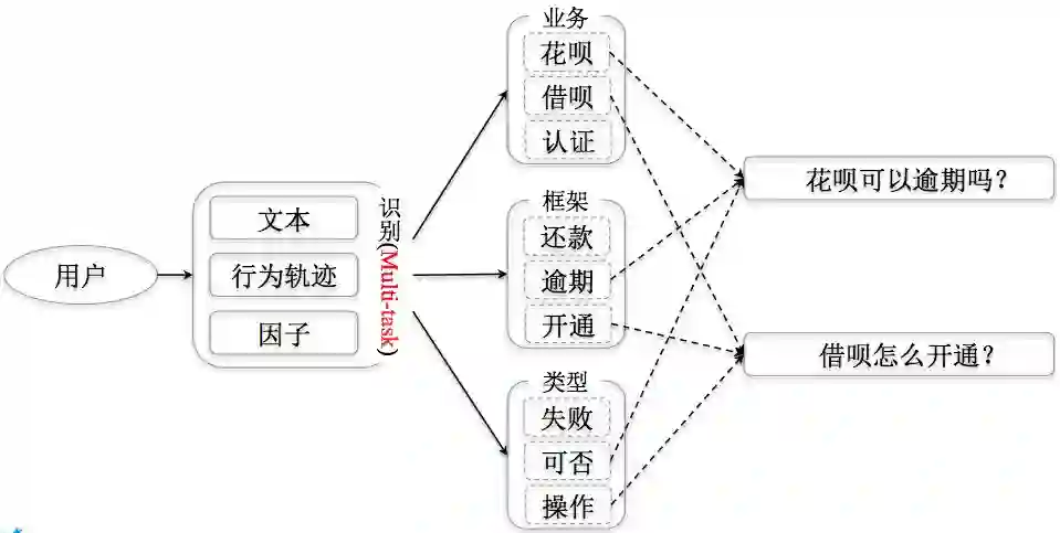 在三要素识别阶段,我们同样利用了用户的服务轨迹、因子和文本等信息,基于混合网络结构,构建了Multi-task的学习任务,相比单模型,识别准确率可以提升7个百分点。