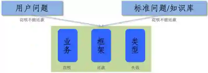 非常幸运的是,我们发现很多的知识点或用户问题都可以直接拆解成三个要素的形态,类似于常说的主谓宾,在我们这里,三要素分别是:业务、框架和问题类型。业务,顾名思义,就是支付宝的一系列业务类别,如花呗、借呗、余额宝等;框架,相比而言有点抽象,一般我们认为一句话或者一个问题的核心动词为框架,如支付、还款、修改等;问题类型,即用户提问的诉求,作为业务和框架的修饰部分,如失败(问原因的)、怎么(问操作方法的)、什么时候(问时间的)。一般情况下,我们认为绝大多数业务知识点或者用户问题,都可以拆解成这样的三要素。下图以“花呗不能还款”为例,对三要素进行了拆解。