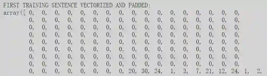 在此之后,由于Keras的工作方式,我们需要填充句子。什么意思?这意味着我们需要搜索最长句子的长度,将每个句子转换为该长度的向量,并用零填充每个句子的单词数和最长句子的单词数之间的差距。