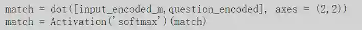 一旦我们为输入句子创建了两个嵌入,并为问题创建了嵌入,我们就可以开始定义模型中发生的操作。如前所述,我们通过在问题的嵌入和情节的嵌入之间进行点积来计算注意力,然后进行softmax。下面显示了该操作的步骤: