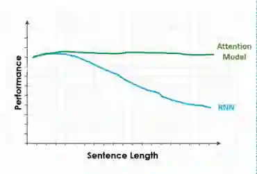 下图显示了当我们增加了输入句子的长度时,RNN与Attention模型的性能变化。当面对一个很长的句子,并要求执行一项特定的任务时,RNN在处理完所有句子之后可能已经忘记了它所拥有的第一个输入。
