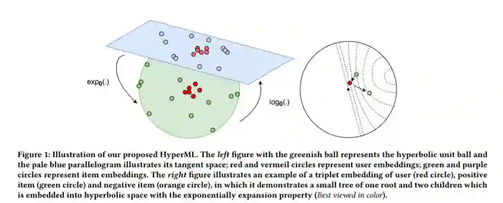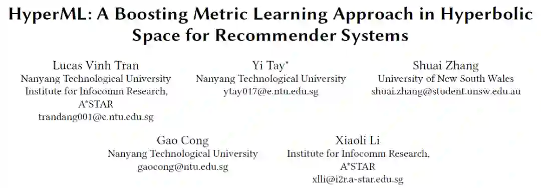 研究了非欧氏空间中学习用户和项目表示的概念。具体来说,我们通过探索Mobius回转向量空间来研究双曲空间中的度量学习与协作滤波之间的关系,该空间的形式可以用来推广最常见的欧氏向量运算。总的来说,这项工作旨在通过度量学习的方法来弥补推荐系统中欧几里德几何和双曲几何之间的差距。我们提出了HyperML(双曲度量学习),这是一个概念简单但效率很高的模型,可以提高性能。通过一系列广泛的实验,我们证明了我们提出的HyperML不仅优于欧几里德模型,而且在多个基准数据集上达到了最新的性能,证明了个性化推荐在双曲几何中的有效性。