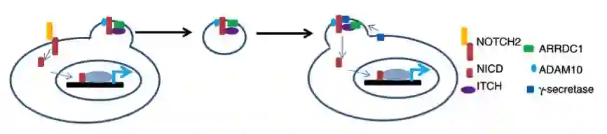 该研究发现的Notch信号传递不同于经典的相邻细胞Notch配体与受体相互作用,而是通过一种被称作ARMMs的细胞外膜泡上的NOTCH2介导与靶细胞的受体作用,从而可不依赖细胞间的直接接触,发挥远距离调控靶细胞的功能。