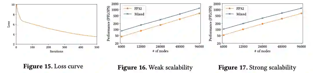 实验结果显示,在 1.93 T 参数规模的时候,计算性能达到了1.18 EFLOPS,当模型增大到 14.5 T的时候,混合精度性能达到1.00 EFLOPS。这足以证明我们的训练系统的高效性。我们对 1.93 T 的模型进行了更长时间的训练,从上图中可以看到,模型表现出了明显的收敛趋势,且最终接近收敛。在强弱扩展性方面,我们分别根据节点规模增长扩展专家个数,或者随着节点规模的增长保持总 batch size 不变进行实验,实验结果表明 BaGuaLu 系统具有良好的强扩展性与接近线性的弱扩展性。