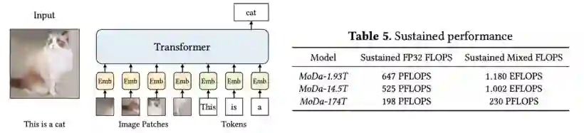 我们基于 BaGuaLu 系统训练了三个多模态预训练模型,模型架构如下左图所示,训练数据来自最大的中文多模态数据集 M6-Corpus,参数规模分别为从万亿到百万亿(1.93 T、14.5 T、174 T)。如下右图所示:
