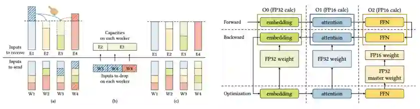 深度学习(Deep Learning)在不同的领域都有重要用途,包括计算机视觉(Computer Vision)、自然语言处理(Natural Language Processing)、推荐系统(Recommender System)等。近年来,基于 Transformer 结构的大规模预训练模型自然语言处理和计算机视觉领域的一系列下游任务中取得了最优的表现。从预训练模型的发展趋势来看,模型的规模与模型的效果呈现正相关的关系已经是学界的共识。随着预训练模型的规模的急剧增长,大规模模训练需要越来越大量的计算和内存能力,这无疑促进了人工智能和高性能计算的融合。然而,由于缺乏软硬件特性的协同设计,在超级计算机系统上高效训练大规模预训练模型仍然存在来自并行策略、数据存储、数据精度与负载均衡等多个方面的巨大挑战。如何在特定硬件架构下超大模型选取最高效的并行方式?在单精度下,万亿模型的参数高达 4 T,再加上模型的梯度、优化器的更新参数与计算中间值,总共需要 768 块 V100 才能存储,如此大的参数量如何进行高效划分?在训练中,更低的精度需要的内存量更小、性能更好,然而,低精度会带来模型准确度下降,如何选择合适的数据精度使得模型仍然能够正常收敛?此外,MoE 模型的专家存在严重的负载不均衡问题,如何改善这一现象提升训练效率?