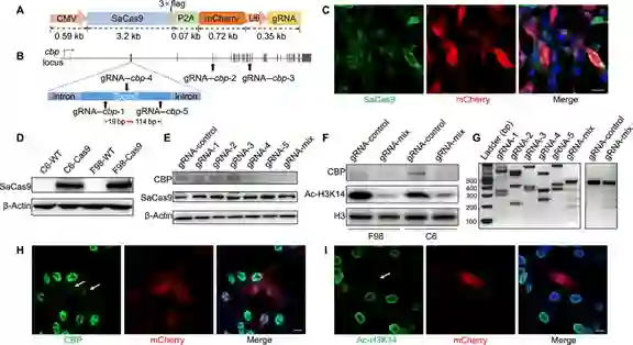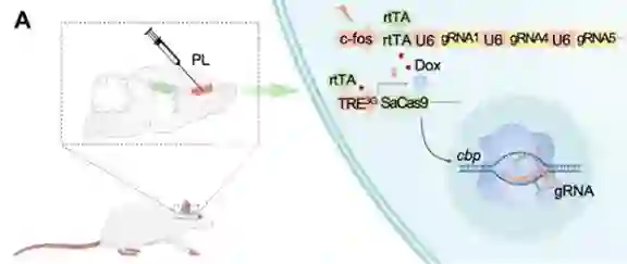 为了验证新搞出来的CRISPR-SaCas9(以下用SaCas9指代)也可解决第一个问题,即编辑特定神经元亚群中的靶基因,他们选择了对神经元兴奋性和记忆形成至关重要的CBP作为靶基因(它可产生CREB结合蛋白),在某个神经元亚群中定点敲除它。