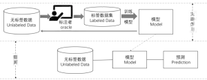 为了更好的理解主动学习的流程,首先先回顾一下监督学习流程。监督学习分为训练(train)和预测(Prediction)两个阶段,在训练阶段通过标签数据集来确认模型的参数,得到一个模型。在预测阶段将无标签的数据输入到已经训练好的模型,得到一个预测的标签。