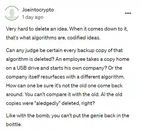 也有人指出,这个命令执行起来是很困难的。因为你很难知道对方有没有真的将算法删除。「万一有个员工用 U 盘将算法拷回家,回头重新开个公司怎么办」。