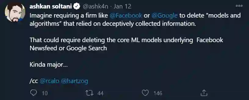 「想象一下 Facebook 或 Google 这样的公司被要求删除其类似算法会是什么结果。可能最后删得核心模型都不剩了。」