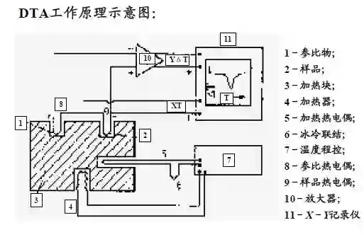 操作方法:用两个尺寸完全相同的白金坩埚,一个装参比物,另一个装待测样品;将两只坩埚放在同一条件下受热,热量通过试样容器传导到试样内,使其温度升高,在试样内会形成温度梯度;温度的变化方式会依温度差热电偶接点处的位置而不同;温点插入试样和参比物中,或坩埚外的底部。