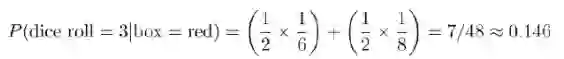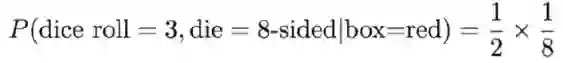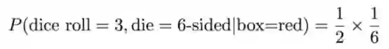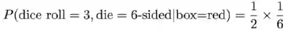 P(掷骰= 3,骰子面数= 6面,盒子=红)是我们掷出3的概率,因为我们拿起了6面的骰子并且它在红盒子中。这个概率为1/6。
