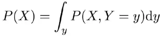 然而,当我们使用在给定边界内具有无限可能值的变量时(例如0到10米之间的距离度量可以具有无限数量的值,例如5米,5.1米,5.01米,5.001米,5.0001 m,...等等),我们把这些称为“连续变量”,我们不使用“Σ”符号。相反,我们使用“ ∫ ”。这个符号仍然告诉我们,我们必须把所有东西都加起来,但是我们知道,这时候妨害变量是连续的,所以把边缘化写成: