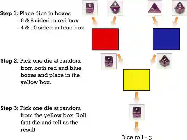 我从黄箱子里随机选择一个骰子,掷骰子并告诉你结果。