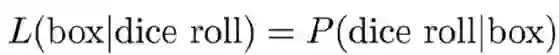 这意味着可能性L(box=red| dice roll =3),等同于骰子来自于红框,投掷出3的概率,即P(dice roll =3|box=red)。类似地,L(box=blue| dice roll =3) = P(dice roll =3| box=blue)。