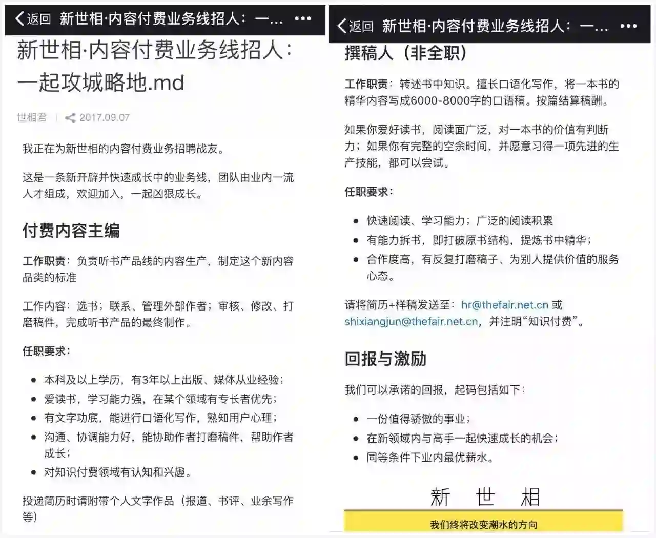 新榜讯 今天,“新世相”方面流出的一份招聘文案显示,它正在进军内容付费业务,招聘付费内容主编及兼职撰稿人(如图所示),将推出拆书、听书产品。