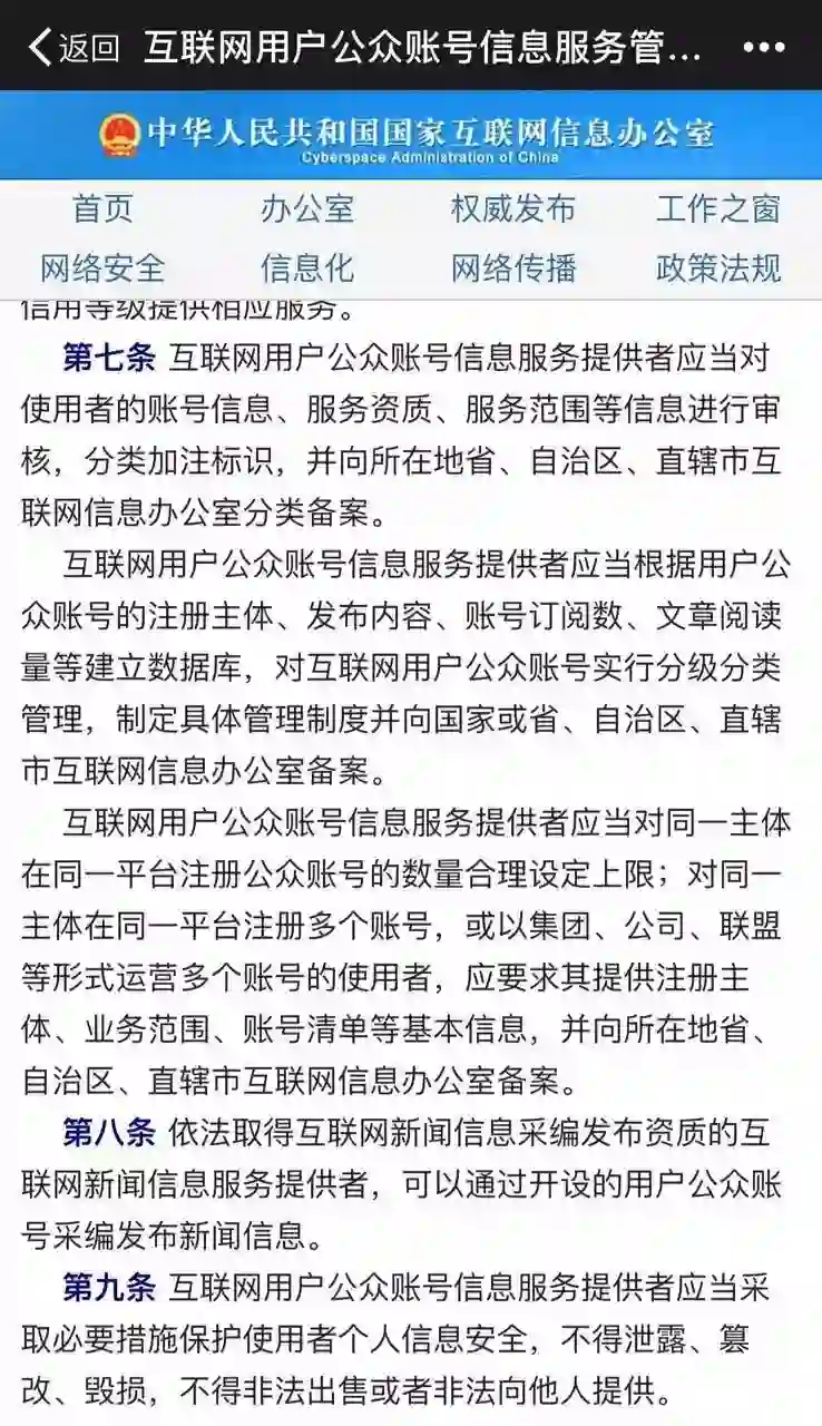 其中,《互联网用户公众账号信息服务管理规定》明确规定: