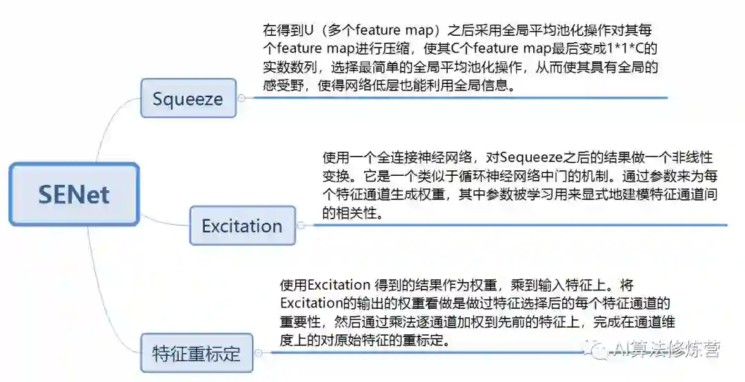通俗的说就是:通过对卷积的到的feature map进行处理,得到一个和通道数一样的一维向量作为每个通道的评价分数,然后将改分数分别施加到对应的通道上,得到其结果,就在原有的基础上只添加了一个模块。