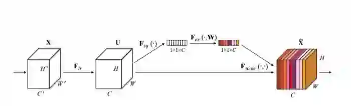 上图是SENet的Block单元,图中的Ftr是传统的卷积结构,X和U是Ftr的输入(C'xH'xW')和输出(CxHxW),这些都是以往结构中已存在的。