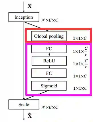 这是文中给出的一个嵌入Inception结构的一个例子。由(H*W*C)全局平均池化得到(1*1*C),即S步;接着利用两个全连接层和相应的激活函数建模通道之间的相关性,即E步。E步中包含参数r的目的是为了减少全连接层的参数。输出特征通道的权重通过乘法逐通道加权到原来的特征上,得到(H*W*C)的数据,与输入形状完全相同。