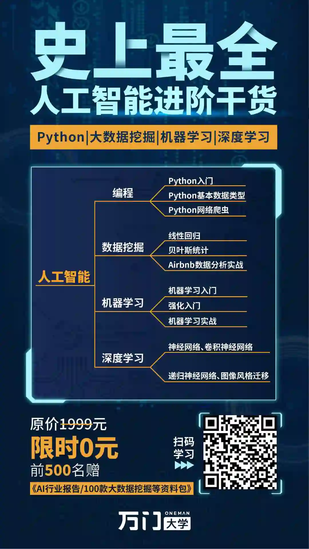 万门的课程除了人工智能、大数据、数据挖掘,更有经济金融、数学物理、心理哲学、博弈论、音乐美术等,还有小学、中学、K12,这些课程都有免费,大家扫码后,按照要求操作即可领取。