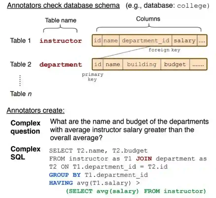 上图是该数据集中的一条样例。在这个以 College 为主题的数据库中,用户询问「讲师的工资高于平均工资水平的部门以及相应的预算是什么?」,模型需要根据用户的问题和已知的数据库中各种表格、字段及其之间错综复杂的关系来生成正确的 SQL。