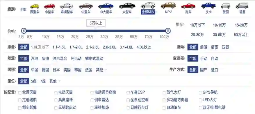 在 AI、区块链、IoT、AR 等高新技术飞速发展的当下,数据库这一宝库似乎被大家遗忘在了角落。数据库存储了大量的个人或者企业的生产运营数据,我们每天都会和数据库产生或多或少的交互。通常,查询数据库中的数据需要通过像 SQL 这样的程序式查询语言来进行交互,这就需要懂 SQL 语言的专业技术人员来执行这一操作。为了让非专业用户也可以按需查询数据库,当前流行的技术方案设计了基于条件筛选的专门界面,用户可以通过点选不同的条件来查询数据库,比如下面这个筛选汽车的界面。