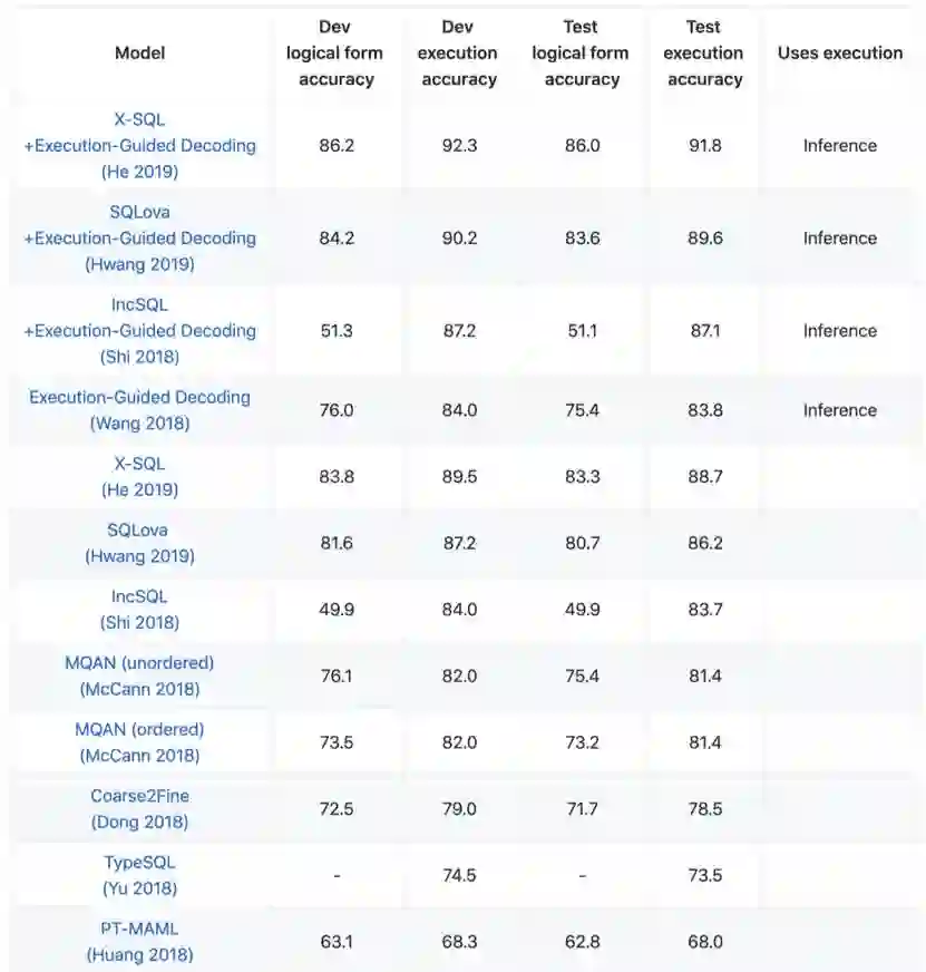 该数据集自提出之后,已经有 18 次公开提交。由于 SQL 的形式较为简单,该数据集不涉及高级用法,Question 所对应的正确表格已经给定,不需要联合多张表格,这些简化使得强监督模型已经可以在 WikiSQL 上达到执行 91.8% 的执行准确率。
