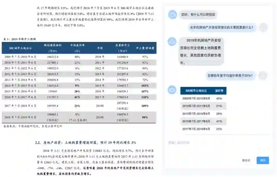 表格数据是信息在经过人为整理、归纳后的一种高效的结构化表达形式,信息的价值、密度和质量高于普通的文字文本。用很多文字才能描述清楚的信息,可能一张表格就够了。在行业研报、业绩报告、新闻公告、使用说明书等各种书面信息载体上,尤其是金融、快消等行业的各种报告中,充斥着许多表格形式的结构化数据。而当用户去查询表格中的内容时,需要肉眼去从表格中筛选满足条件的数据,准确率和效率都较低。通过 NL2SQL,用户在查询这些表格的内容时,可以直接通过自然语言与表格进行交互,并得到结果,用户体验会很自然。比如下面这张出自某房地产行业研报的表格: