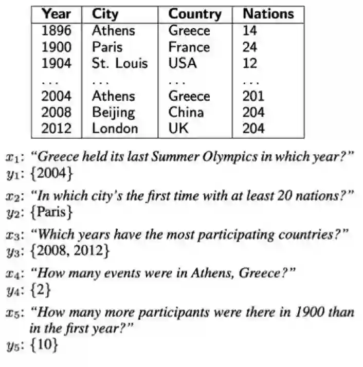 WikiTableQuestions 是斯坦福大学于 2015 年提出的一个针对维基百科中那些半结构化表格问答的数据集,包含了 22,033 条真实问句以及 2,108 张表格。由于数据的来源是维基百科,因此表格中的数据是真实且没有经过归一化的,一个 cell 内可能包含多个实体或含义,比如「Beijing, China」或「200 km」;同时,为了很好地泛化到其它领域的数据,该数据集测试集中的表格主题和实体之间的关系都是在训练集中没有见到过的。下图是该数据集中的一条示例,数据阐述的方式展现出作者想要体现的问答元素。