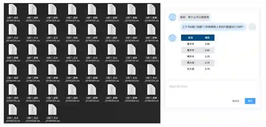 存储在 Excel 中的表格数据也可以被利用起来。设想一下这样的场景,财务人员将日常的财务数据存储在 Excel 中,日积月累产生了大量的 Excel 文件。财务人员需要了解其中的数据时,首先要从层层深入的文件夹、密密麻麻的 Excel 中找到正确的文件,然后打开 Excel 文件去密集的单元格中找到想要的答案。在这个过程中找错文件是常事,效率十分低下。如果利用 NL2SQL 技术,这一场景就会非常的优雅高效:首先定位预处理存入数据库的表格,再执行查询逻辑,最后将结果直接返回。