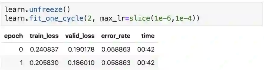 我们总是可以调用unfreeze函数来训练所有网络层,然后再使用fit或fit_one_cycle。这就是所谓的“微调”,这是在调整整个网络的参数。