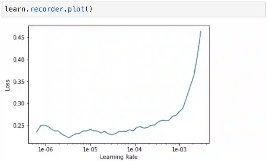 recorder.plot可用于绘制损失与学习率的关系图。当损失开始发散时,停止运行。