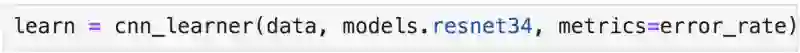 cnn_learner 使用来自给定架构的预训练模型构建CNN学习器、来自预训练模型的学习参数用于初始化模型,允许更快的收敛和高精度。我们使用的CNN架构是ResNet34。下图是一个典型的CNN架构。