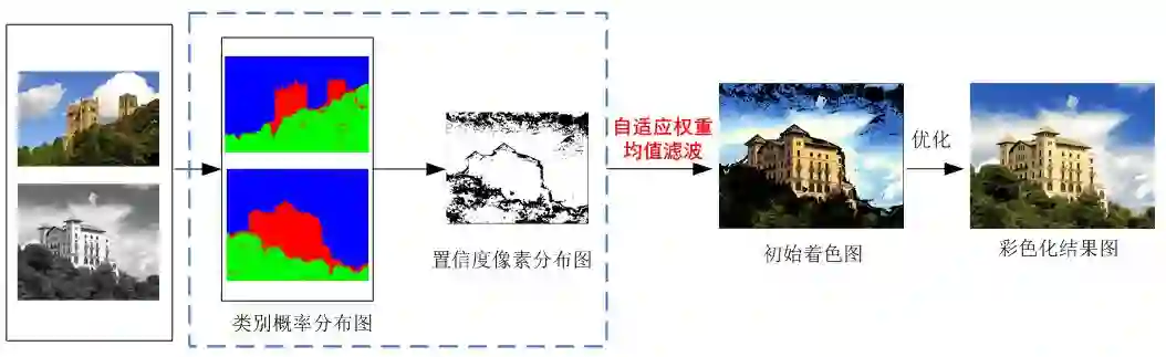 同时根据初步迁移结果对低置信度像素点进行颜色扩散,最终完成灰度图像彩色化。