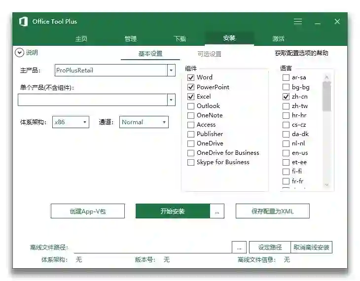 这款工具可以一次性安装 Office、Visio、Project 等应用,还可以选择不同的授权版本。自定义 Office 的组件及语言,并可以保存配置为 XML 用于批量部署。此处的安装即在线安装,所有文件均是从微软服务器下载。