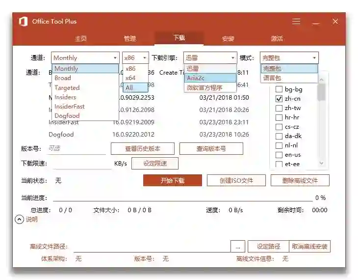 Office 套件目前共有 5 个通道,推荐办公人士使用 Board 稳定通道防止影响工作。工具还提供迅雷下载、Aria2 及微软官方下载器下载,同时为了避免影响下载时的正常工作,可以将速度进行限制,当下载完成后软件还会自动读取离线安装包所在目录。