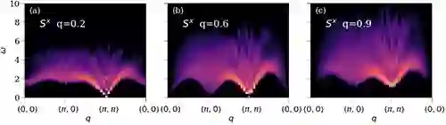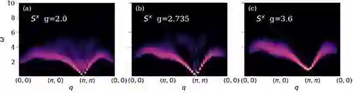 该团队运用量子蒙特卡洛和随机解析延拓的大规模计算方法 (quantum Monte Carlo and stochastic analytic continuation) ,计算了 图1 (a) 和 (b) 的两种相变过程中系统的自旋激发谱,结果总结在 图2 和 图3中。图2 (a), (b) 和 (c) 是去禁闭量子相变对应的过程。图1 (a) 系统仍在 AFXY 相里,能谱上得到自旋波的图像,在 (π, π) 点处自旋波为无能隙的 Goldstone 模,在其他动量点上自旋波色散开来,谱线在能量上的展宽来自于自旋波之间的散射。但在 图2(b) 中,系统接近 DQCP,整个能谱在 w(能量) – q (动量) 空间上生成出漂亮的连续谱。这连续谱有几个突出的特点: