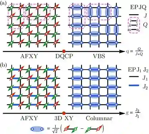图1(a) 具有去禁闭量子临界点的 易磁化面 J-Q (EPJQ) 模型。q=Q/(J+Q) 为相变的调控参数。q < DQCP,系统具有破缺自旋旋转对称性的 易磁化面 反铁磁长程序 (antiferromagnetic XY order, AFXY);q > DQCP,系统具有破缺晶格旋转对称性的共振价键长程序 (valence bond solid, VBS)。两者之间是去禁闭量子临界点, DQCP。(b) 具有普通3DXY 量子临界点的 易磁化面 J1-J2 (EPJ1J2) 模型。g=J2/J1 为相变的调控参数。g < 3DXY, 系统具有破缺自旋旋转对称性的 AFXY 长程序;g > 3DXY,系统进入没有破缺任何对称性的 VBS。两者之间是 3DXY 相变点,服从 LGW 描述。