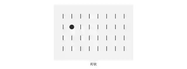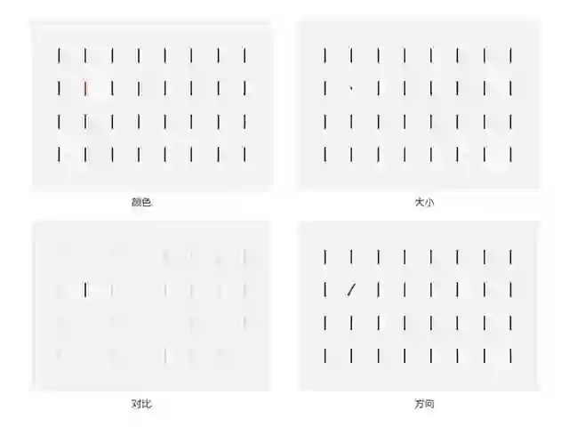 通过去预设目标对象和干扰对象的颜色、大小、对比和方向的不同特征属性。观察者也可以快速的通过这种“特征搜索” 迁移注意点。