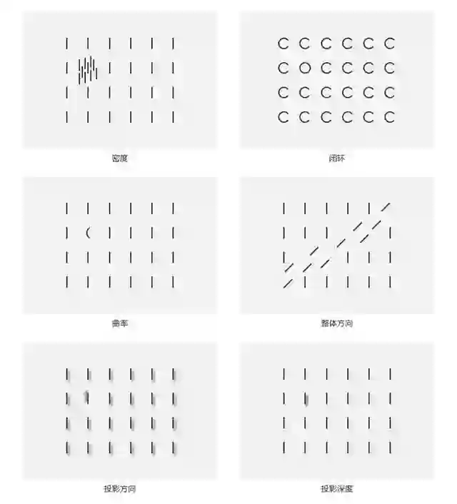 除了上述列举的【形状】、【颜色】、【大小】、【对比】、【方向】。还列举出一下视觉元素的对比【密度】、【闭环】、【曲率】、【整体方向】、【投影方向】和【投影深度】。