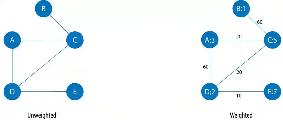 未加权图(Unweighted Graphs)的节点和边上均没有权重。对于加权图(Weighted Graphs),所加权重可以代表:成本、时间、距离、容量、甚至是指定域的优先级。下图给出了示意图。