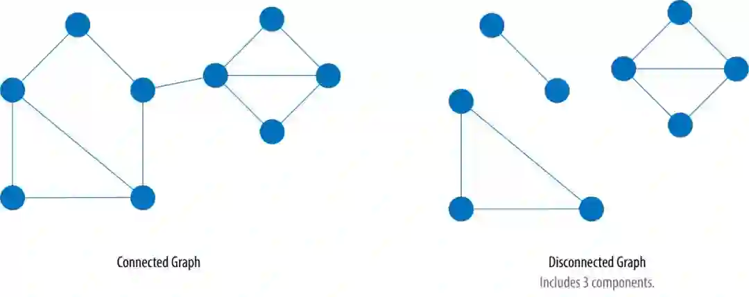 连通图(Connected Graphs)指图内任意两个节点间,总能找到一条路径连接它们,否则,为非连通图(Disconnected Graphs)。也就是说,如果图中包含岛(Island),则是非连通图。如果岛内的节点都是连通的,这些岛就被成为一个部件(Component,有时也叫 Cluster)。