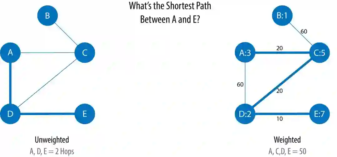 如果没有权重,计算最短路径时,实则在计算关系(Relation,也称 Hop)的数量。那么在上图左边,我们找到 A 和 E 之间的最短距离为 2,经过 D 点。如果像上图右边所示,边被赋予了权重,用以代表节点之间的物理距离(单位:KM)。那么我们可以找到 A 和 E 之间的最短距离是 50 KM,需要经过 C 和 D 两个点。而此时,在未加权图中计算的最短路径 A-D-E 距离为 70 KM,比我们找到的路径 A-C-D-E 距离远。