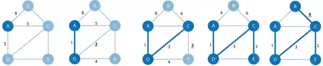 上图是最小生成树算法的步骤分解,算法最终用最小的权重将图进行了遍历,并且在遍历的过程中,不产生环。