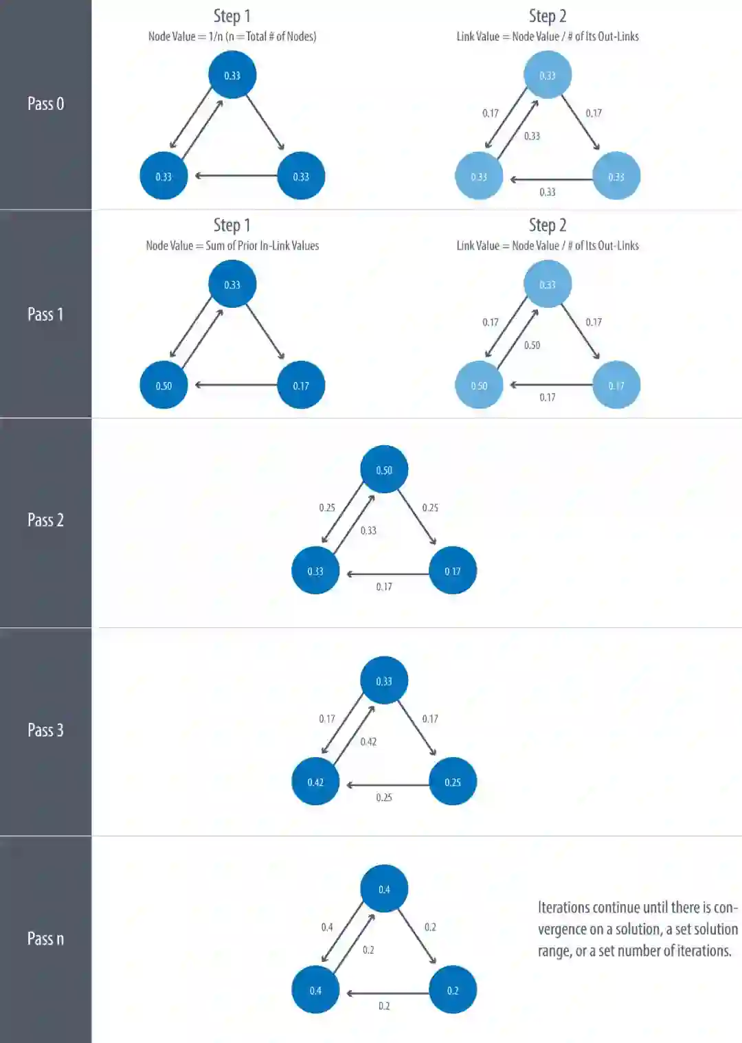 PageRank 算法采用迭代方式计算,直到结果收敛或者达到迭代上限。每次迭代都会分两步更新节点权重和边的权重,详细如下图:
