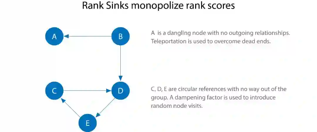 解决 Rank Sink 的方法有两个。第一个,假设这些节点有隐形的边连向了所有的节点,遍历这些隐形的边的过程称为 teleportation。第二个,使用阻尼系数,如果我们设置 d 等于 0.85,我们仍然有 0.15 的概率从这些节点再跳跃出去。
