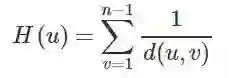 理解公式我们就会发现,如果图是一个非连通图,那么我们将无法计算紧密性中心性。那么针对非连通图,调和中心性(Harmonic Centrality)被提了出来(当然它也有归一化的版本,你猜这次n-1应该加在哪里?):