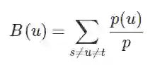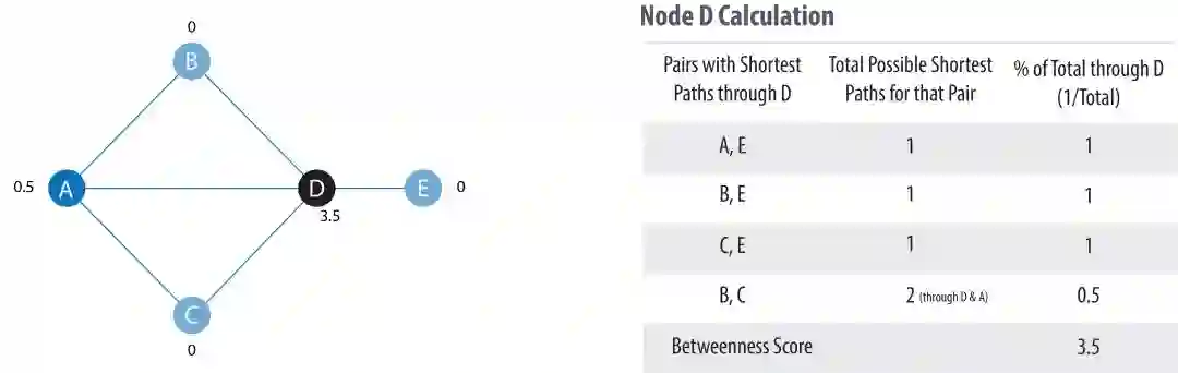 其中,p 是节点 s 与 t 之间最短路径的数量,p(u) 是其中经过节点 u 的数量。下图给出了对于节点 D 的计算过程: