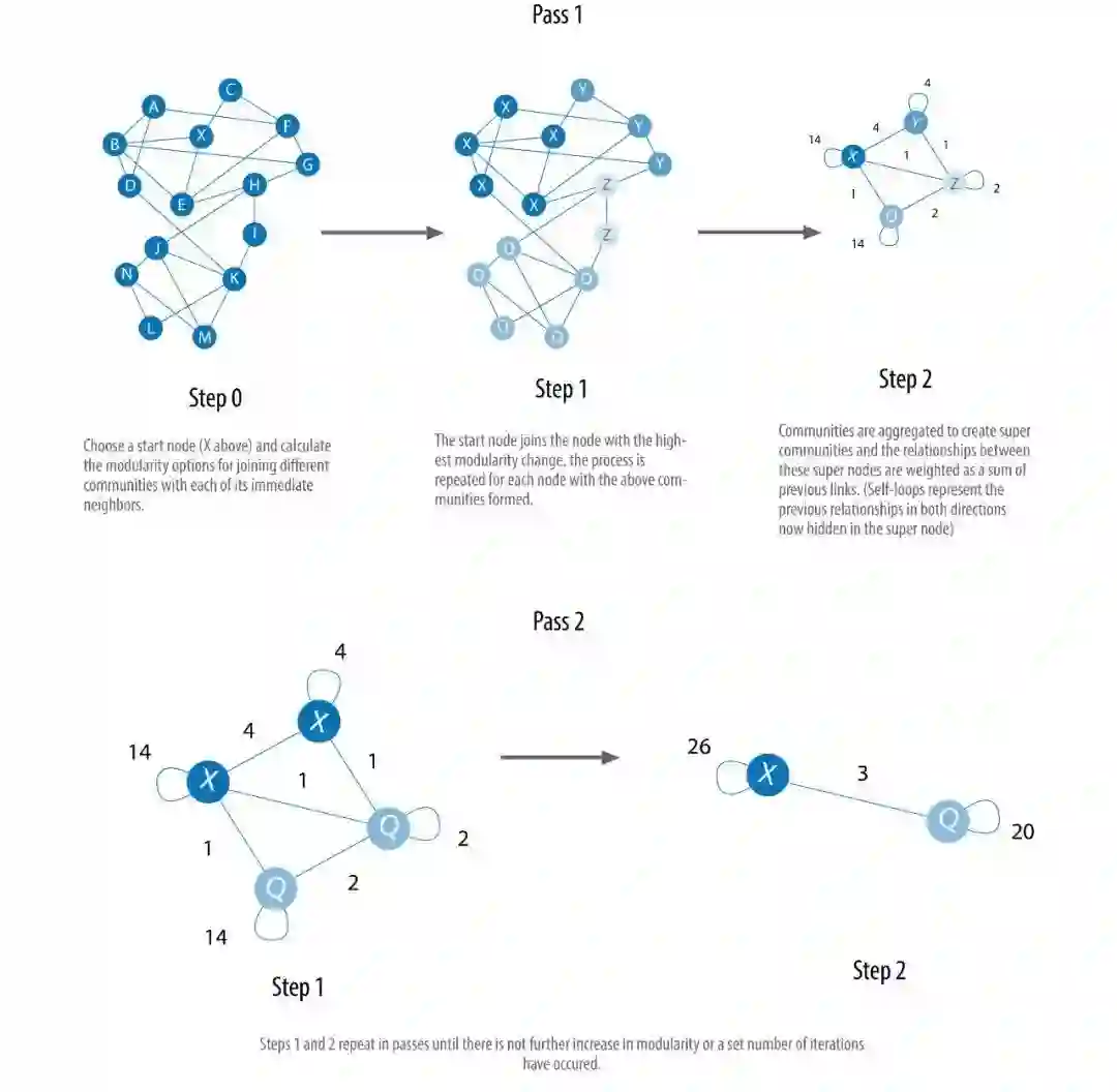 算法在 2008 年被提出以后,迅速成为了最快的模块化算法之一。算法的细节很多,我们无法一一覆盖,下图给出了一个粗略的步骤,帮助我们理解算法如何能够多尺度地构建社群: